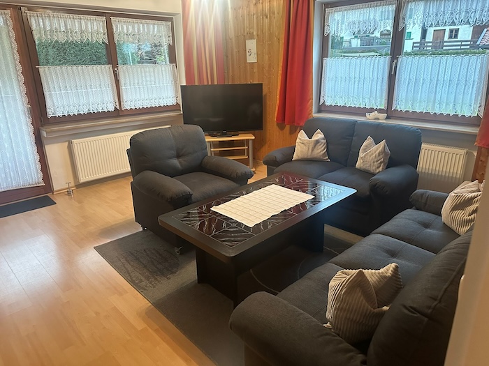 Ferienwohnung Eva-Maria 3-Zimmer-Wohnung im Erdgeschoss rechts, für 2 - 5 Personen, ca. 85 qm Grosser Westbalkon mit Balkonmöbel Gemütliches Wohnzimmer mit Couchgarnitur, SAT-Flachbild-TV, Radio und Zugang zum Westbalkon mit Balkonmöbel und Bergblick. Komplett ausgestattete Wohnküche mit 4-Plattenherd, Backofen, Mikrowelle, Kaffeemaschine, Wasserkocher, Kühlschrank mit Gefrierfach und gemütlichem Essplatz. Grosses Schlafzimmer mit Doppelbett und Liege für die dritte Person. Schlafzimmer mit Doppelbett. Badezimmer mit Wanne, Waschbecken und WC. Zentralheizung. WLAN. Parkplatz direkt am Haus. Abstellraum für Ihre Räder oder Ski. Hund möglich, bitte anmelden. Im Preis inbegriffen: Strom, Wasser, Heizung, Bettwäsche, Handtücher, Tischwäsche und Endreinigung. Preis pro Tag für 1-2 Personen Euro 70,00, für jede weitere Person Euro 15,00. Kinderermässigung. Mindestaufenthalt: 5 Übernachtungen |